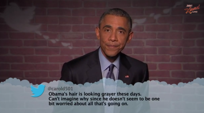 @mashable Obama reads mean tweets@JimmyKimmelLive http://on.mash.to/1GLlIyE pic.twitter.com/RmJteUdZth