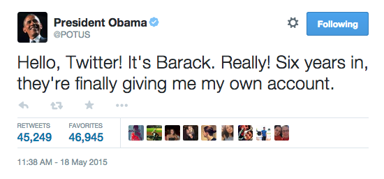 @mashable: Obama sends his first tweet from new@POTUS Twitter account — using an iPhone http://on.mash.to/1QXmDyK pic.twitter.com/MsLyEx0SBU”
