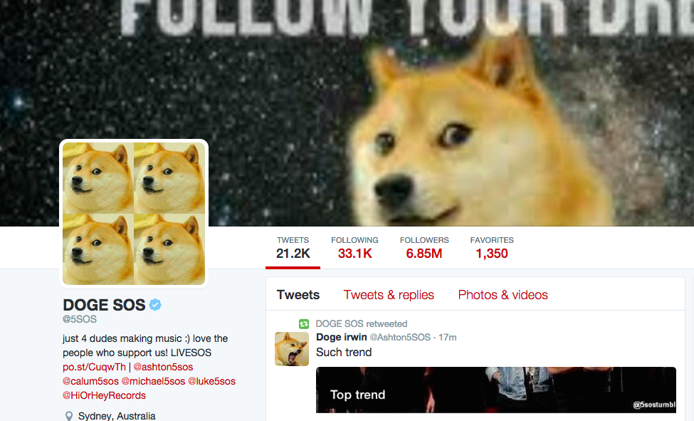 @mashable: 5 Seconds of Summer just revived the doge meme for some strange reason http://on.mash.to/1SK64Ha pic.twitter.com/xq3LFDrPPQ