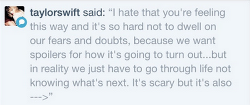 @mashable@taylorswift13 Taylor,very comforting to hear!We'd love to send you/your fan our book for overcoming fears.pic.twitter.com/xMM2V5eIkw