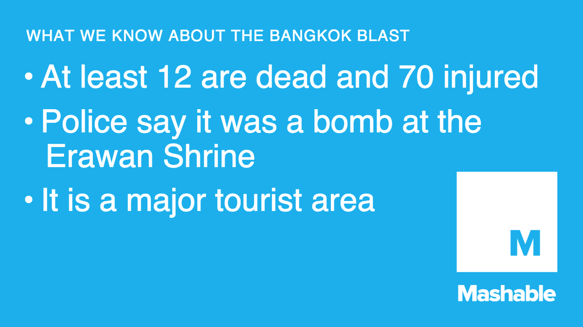 @mashable: Bomb explodes in Bangkok tourist district, killing 12. The latest: http://on.mash.to/1MxbdlH pic.twitter.com/clw2TQzsMW”#Updtae