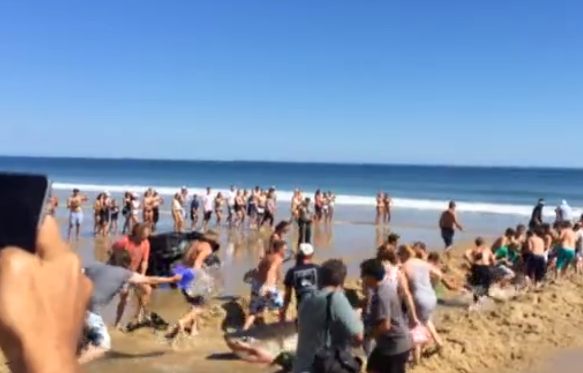 @mashable: Beachgoers band together to rescue a 2,000-pound great white shark http://on.mash.to/1Nms2Ab pic.twitter.com/18IuH62v79”@samjay92