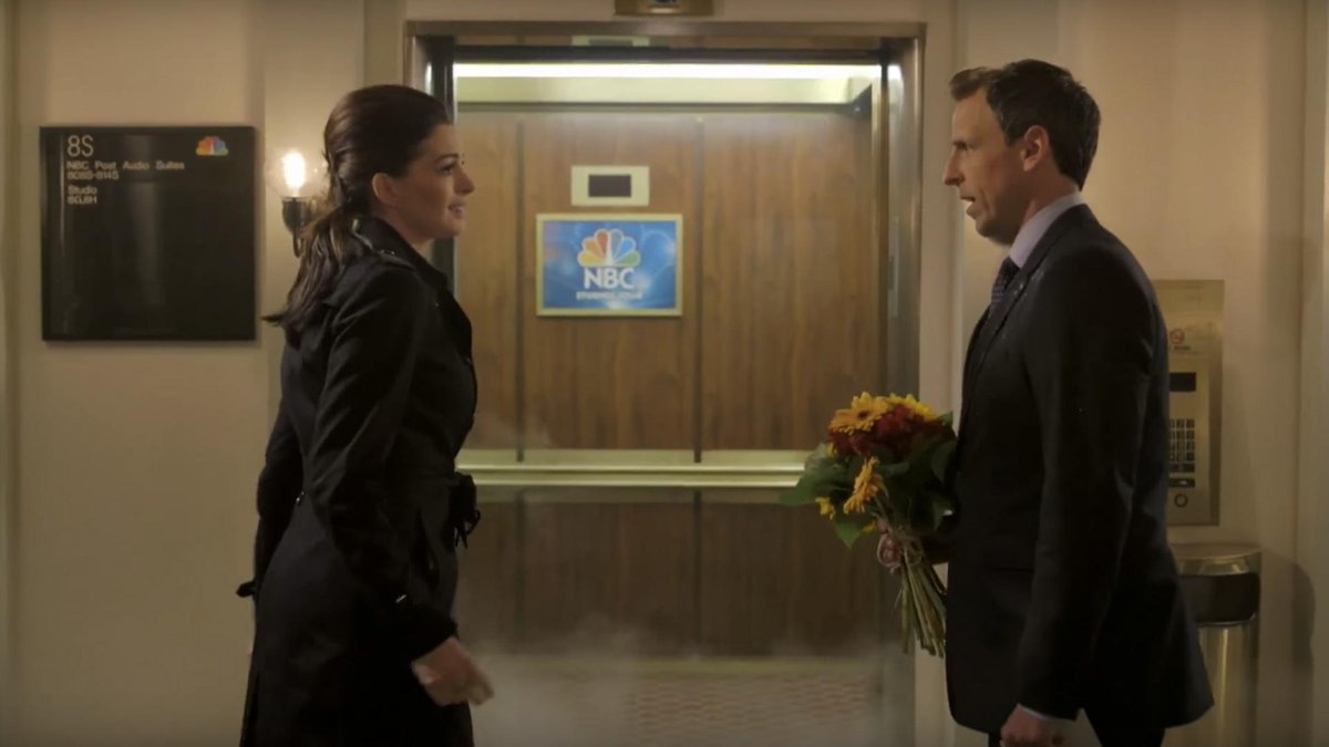 Seth Meyers and Anne Hathaway have a 'last scene in a romantic comedy' interview http://on.mash.to/1Jtk14Y pic.twitter.com/kxoCnTTZdj