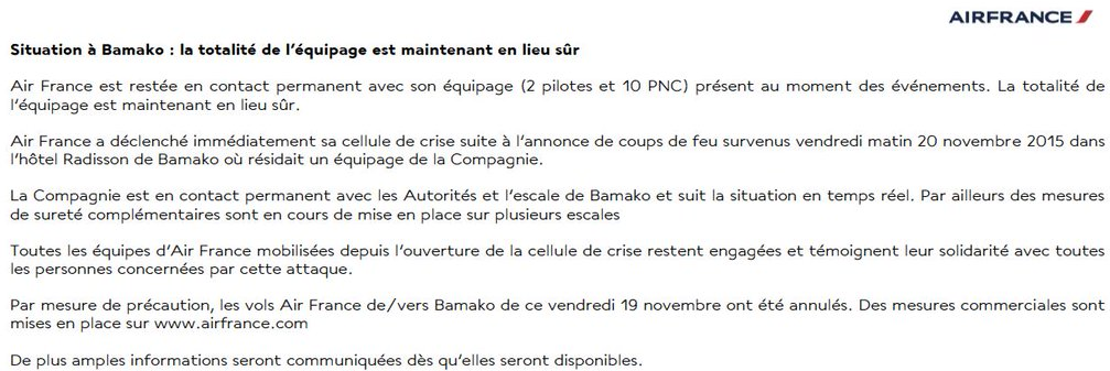 Mali hostage crisis update: @AirFrance confirms its 12 crewmembers made it out of the hotel http://on.mash.to/1kKlGz6 pic.twitter.com/15Hk4Gc6i3