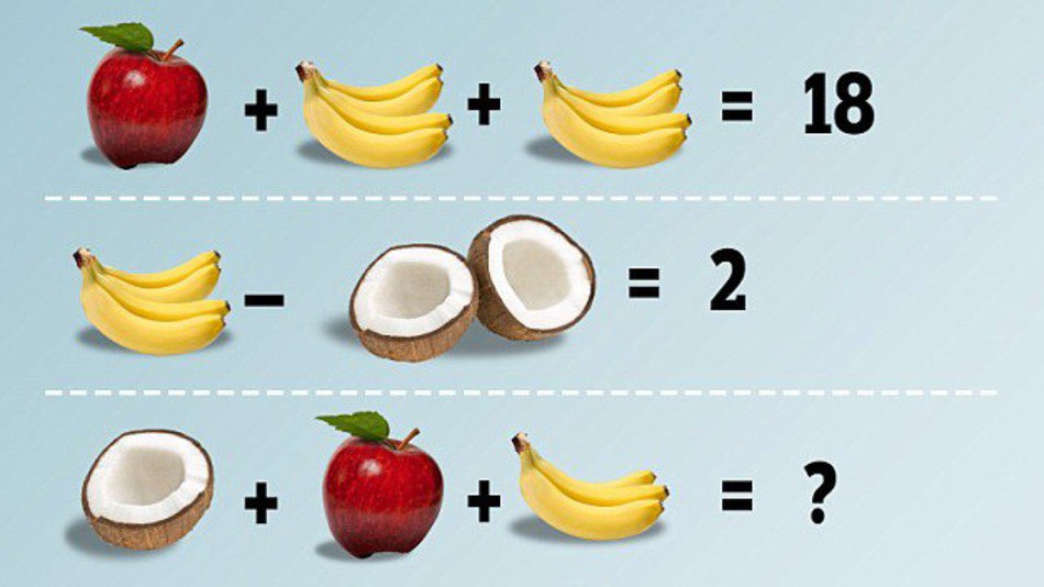 @mashable 14? Apple worth 10. Individual banana worth 1. Half coconut also worth 1. 1+10+3?Thanks. Twitter will use this to make your timeline better. UndoUndo