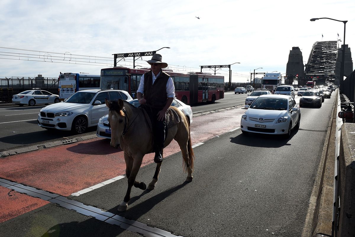 Farmer protests by riding his horse over the Sydney Harbour Bridge http://on.mash.to/28OPb18 pic.twitter.com/6v4PEaDo3c