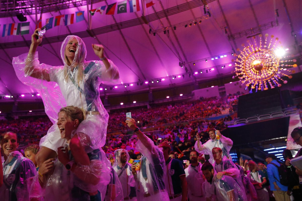 The rain isn't dampening the spirits of the athletes at the #Rio2016 closing ceremony.pic.twitter.com/2H80GYQ985