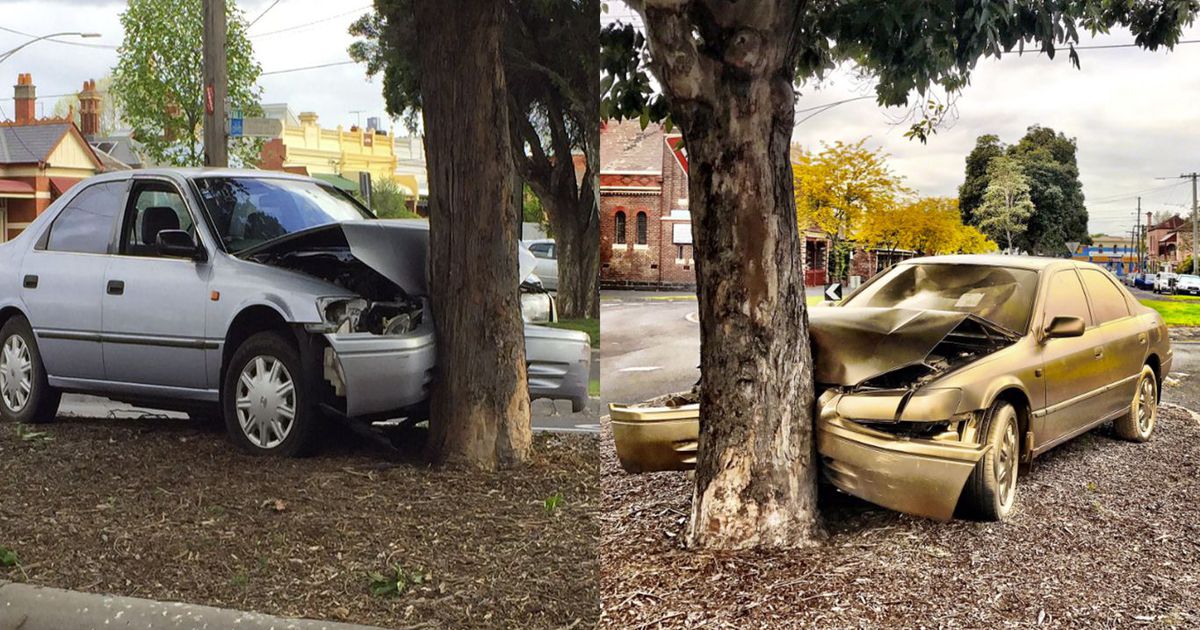 Abandoned car crash given a shiny, golden makeover because #art http://on.mash.to/2eGf8Qy pic.twitter.com/AVRRfwH9V2