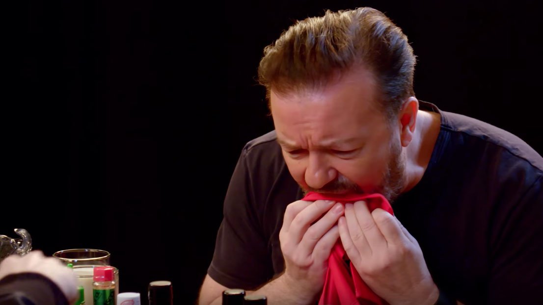 Ricky Gervais still manages to be hilarious while failing the hot wing challenge http://on.mash.to/2kPkVG3 pic.twitter.com/yHSi5z0xx5