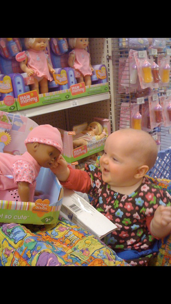 Here's my daughter (now 8) @ 6 months picking out her 1st doll. Most of her dolls are non-white (her pref)pic.twitter.com/lRsYBcZ4Gl