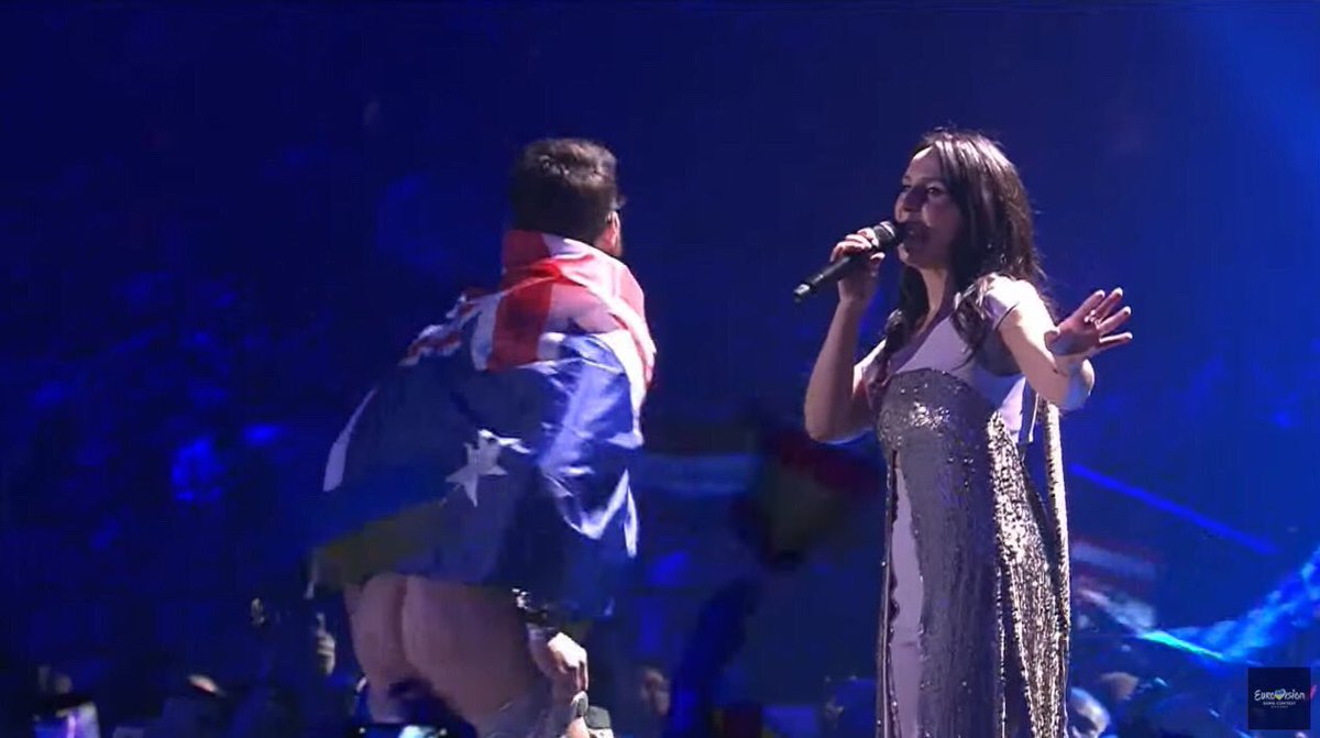 Y'know the guy that mooned everyone onstage at Eurovision wearing an Australian flag? He's not even Australian. http://on.mash.to/2pMffy6 pic.twitter.com/12PWKzGQJT