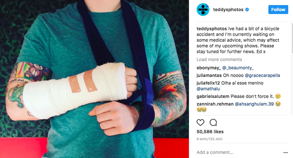 Ed Sheeran shares Instagram post of his bicycle accident injury http://on.mash.to/2ysvesp pic.twitter.com/CoikWAuEKr