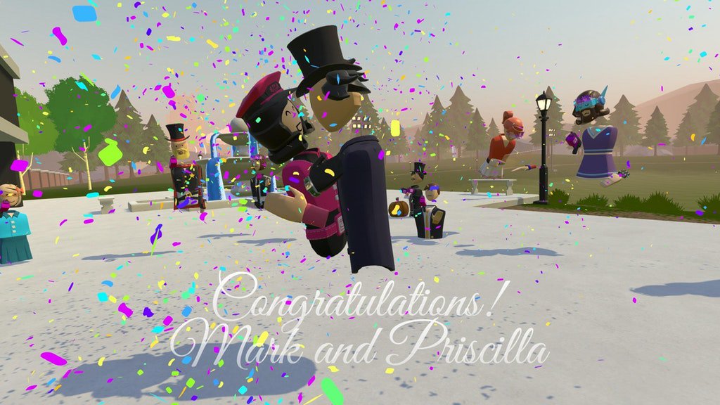 This is great! Congratulations! We had a VR wedding reception in Rec Room a few months ago, attended by the couple's friends and family who were able to join in from around the world :) https://imgur.com/gallery/mlT6F pic.twitter.com/qEroO4IkSN