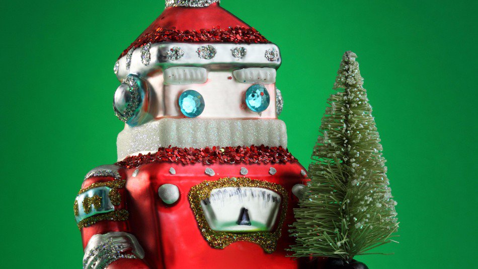 Down through the chimney to steal your toys, Laser toting Santa droids.