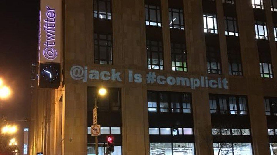 Protestors project '@jack is complicit' on Twitter HQ in response to Trump's 'nuclear button' tweet: http://on.mash.to/2ER5HKf pic.twitter.com/4tlil2aJGl