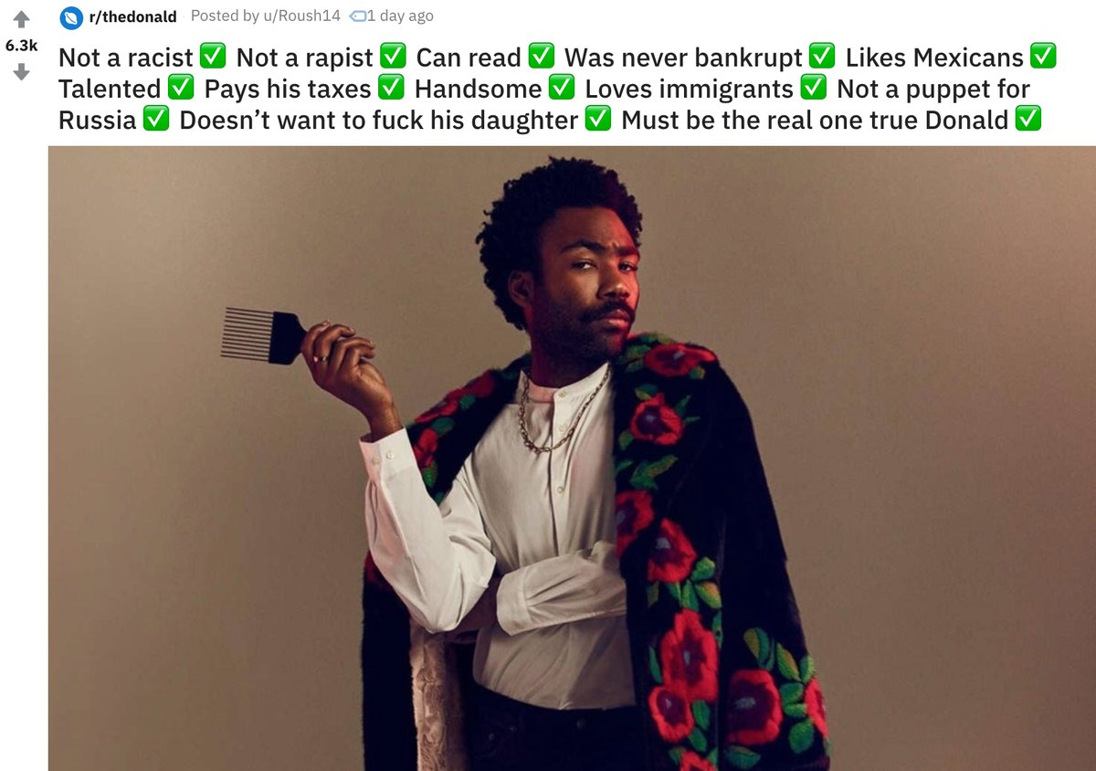 Donald Glover fans have taken over a Donald Trump subreddit to praise their one, true Donald https://trib.al/8ZBgrnB pic.twitter.com/blGWBA17tt
