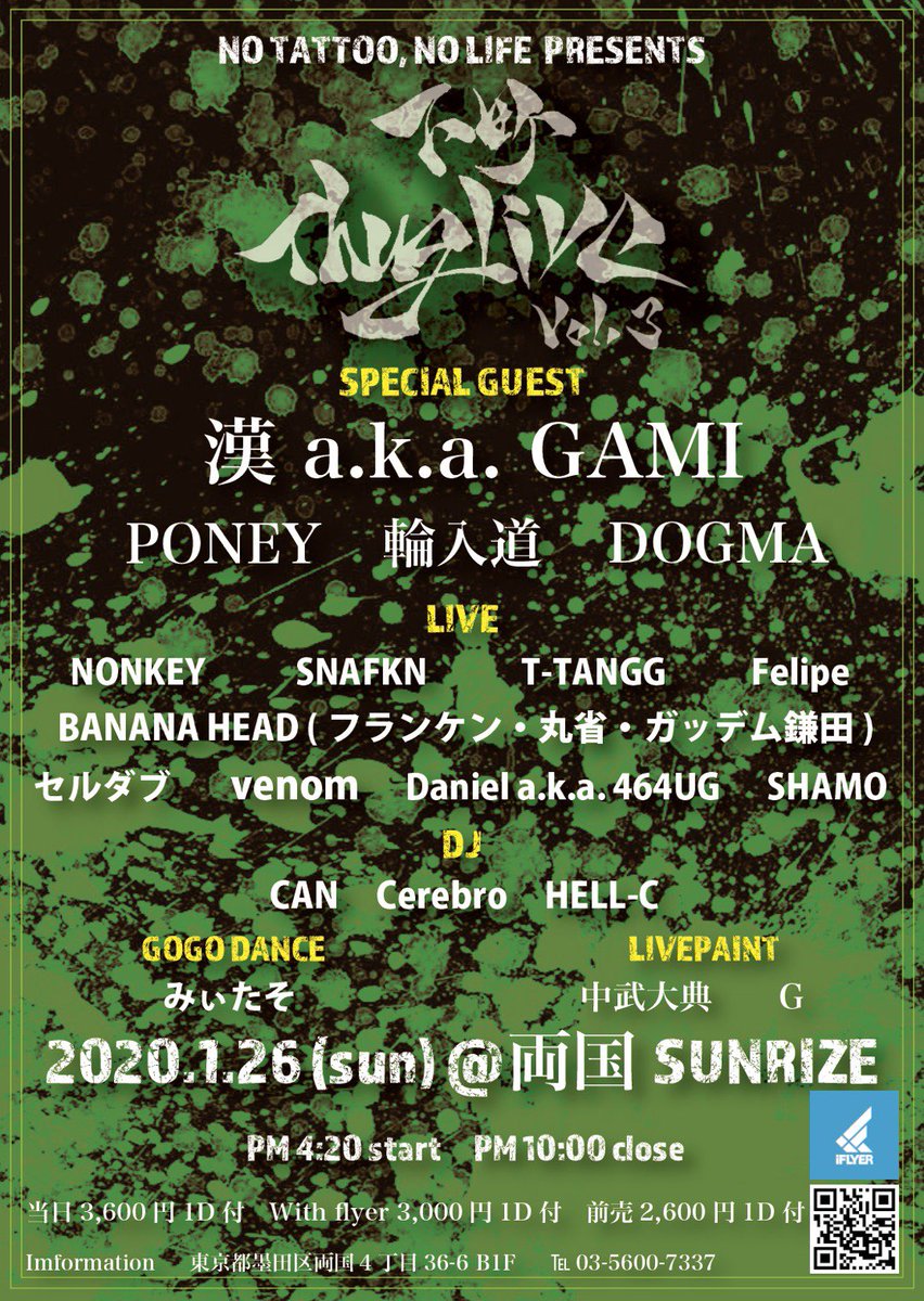 1/26(sun)【下町THUG LIVE Vol.3 at 両国サンライズ】 OPEN 16:20 CLOSE 22:00 当日券 3,600円1D付 小学生以下無料(保護者同伴ID提示) -SP GUEST- 漢 a.k.a. GAMI DOGMA PONEY 輪入道 -LIVE- NONKEY SNAFKN T-TANGG BANANA HEAD セルダブ Felipe INFO http://9sari-group.net/event/3029 pic.twitter.com/fXZZFCbXRx