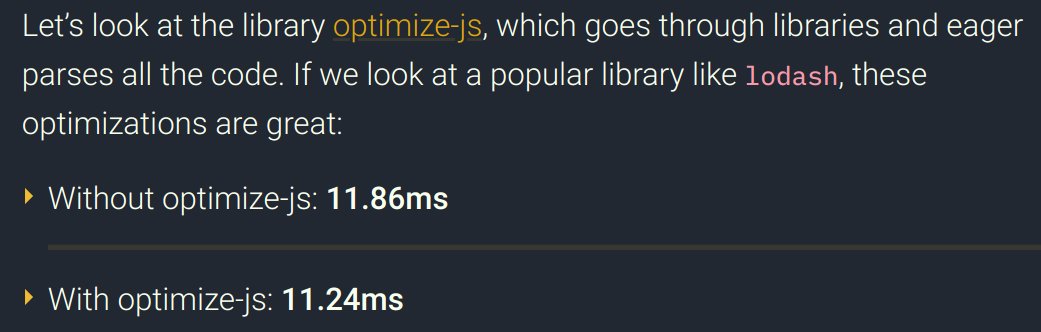 And re: optimize-js, the difference between the numbers you list (0.6 ms) seems insignificant: Without optimize-js: 11.86ms With optimize-js: 11.24ms The V8 team recommends against using optimize-js nowadays: https://v8.dev/blog/preparser#pife …pic.twitter.com/AxEujmWpMj