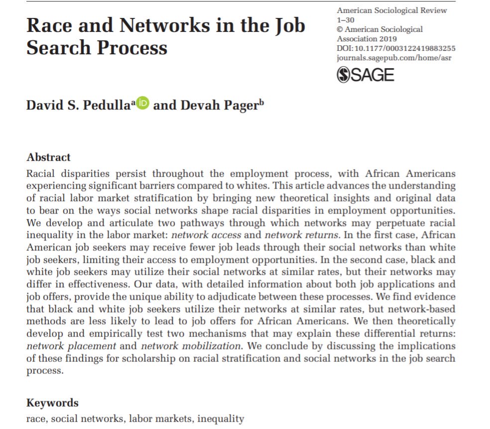 READ NOW! Pedulla and Pager: Black job seekers receive job leads from network contacts at similar rates as whites but are less likely to land a job based on those leads https://tinyurl.com/wrbnqzd pic.twitter.com/luFdAAOpsi