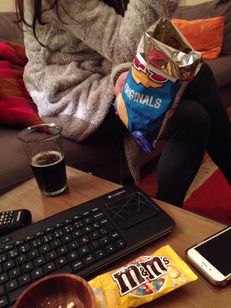 Cuma aksam menusu: atistirmalik; m&m, ana yemek; ruffles, tatli; profiterol, sinirsiz kola.