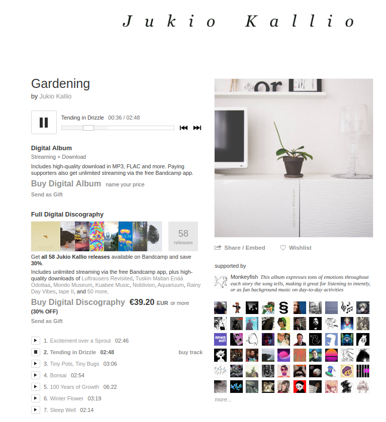 @jukiokallio . It's such a great mix of colorful piano tracks, with the most chill, relaxing and anxiety-easing melodies I've listened to. https://jukiokallio.bandcamp.com/album/gardening pic.twitter.com/fQcc5fBYO9