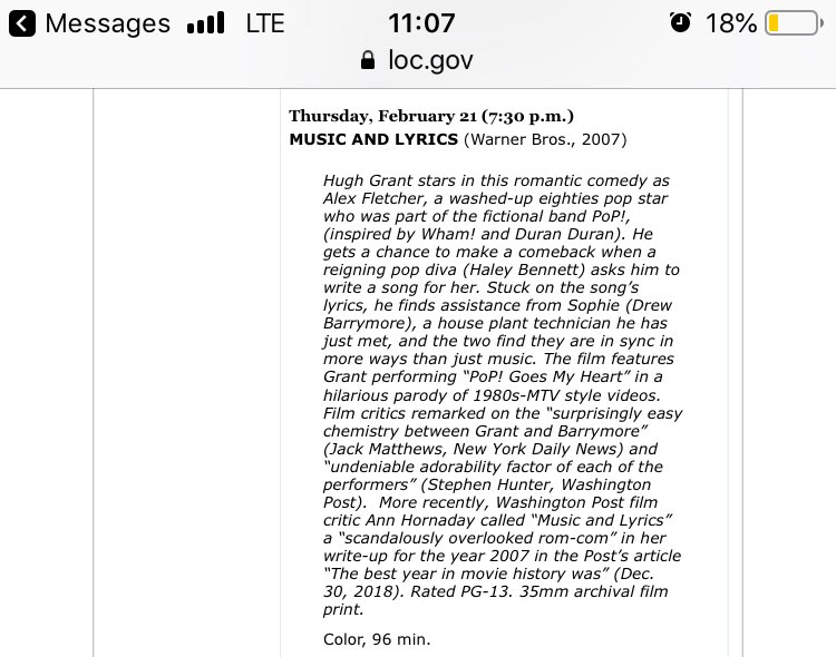 I must meet the person who decided to add extremely underrated rom-com Music And Lyrics to this @librarycongress film festpic.twitter.com/YK5QNBhzKM