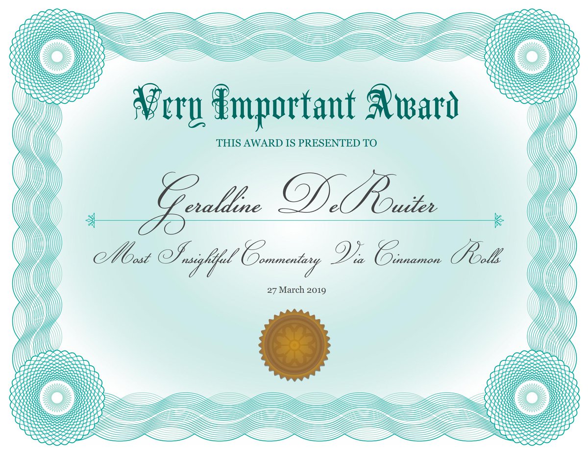 I didn't say WHICH award. It won the "Most Insightful Commentary Via Cinnamon Rolls" award in my heart. There's a certificate and everything.
