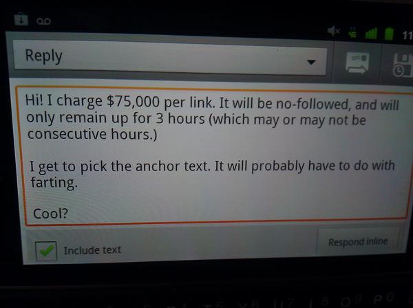 How @everywhereist responds to link buying requests on her blog. Would make @mattcutts proud.pic.twitter.com/G6nLnzHX