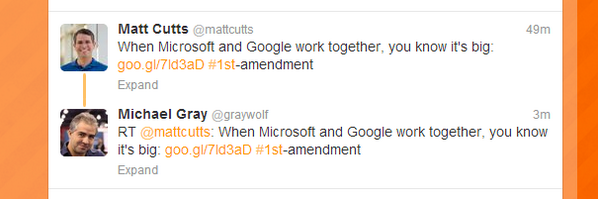 @mattcutts: When Microsoft and Google work together http://goo.gl/7ld3aD#1st-amendmentThanks. Twitter will use this to make your timeline better. UndoUndo