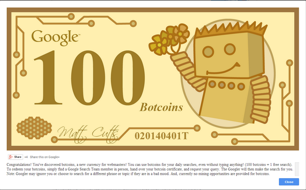 @mattcutts Got my botcoin! Can't wait to cash it in for a free search.#UpUpDownDownLeftRightLeftRightBAThanks. Twitter will use this to make your timeline better. UndoUndo
