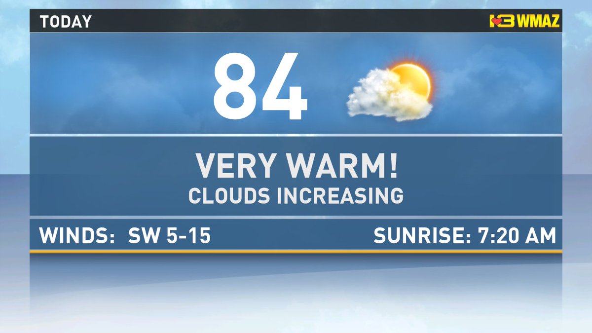 We stay dry today with highs in the low to mid 80s. Rain and a few storms arrive tomorrow morning. http://www.13wmaz.com/article/news/local/mid-80s-likely-today/93-520165677 …pic.twitter.com/Ic28x1JZrz