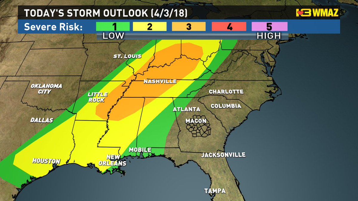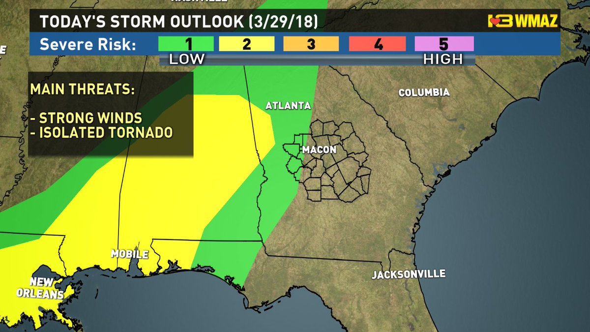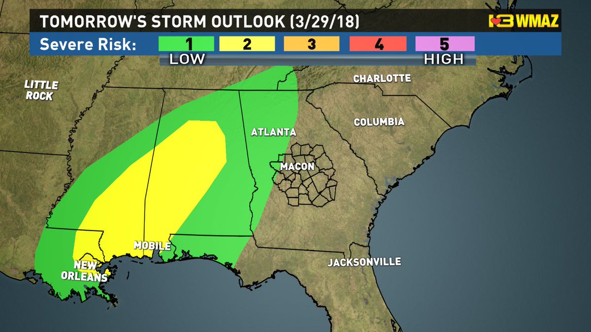 Tomorrow(3/29/18) evening we will be watching a line of showers and embedded thunderstorms move through Central GA (mainly after 8 PM). Can't rule out a strong storm or two, but the greatest threat Thursday remains in Alabama/West GA.