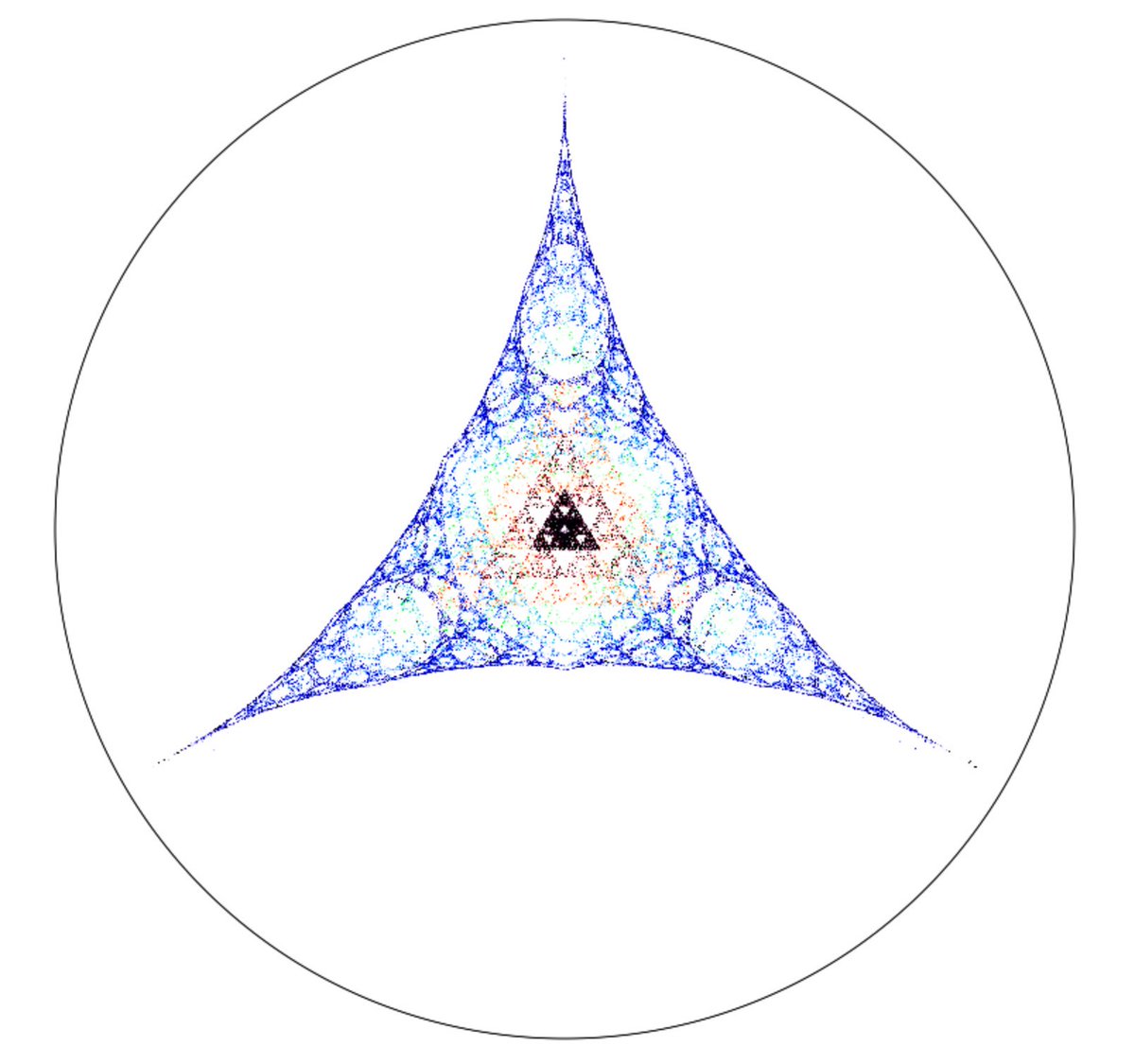 how could you draw a sierpinski triangle in the hyperbolic disk? one way is to start with some points, and repeatedly move each one half way to a random one of the corners, using the hyperbolic geometry. when the corners are close enough, you get the original sierpinskipic.twitter.com/mrFzoyZxdJ