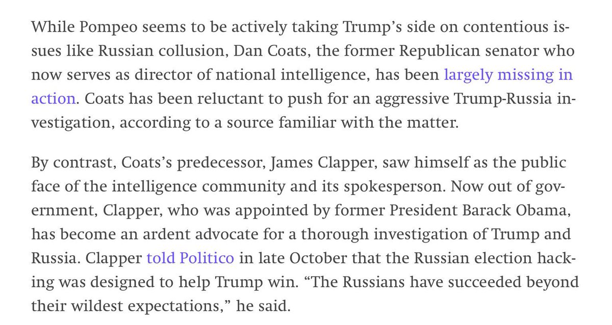 I knew Pompeo was a purely political appointee. So too is Sessions and Coates at DNI. Wray of FBI has been quiet so not sure about him.