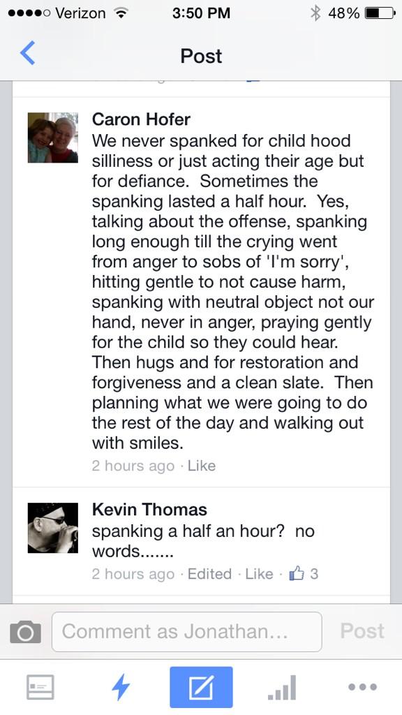A pro-spanking Facebook commenter on recounts her parenting practices: "Sometimes the spanking lasted half an hour."pic.twitter.com/aoFgpI2aFy