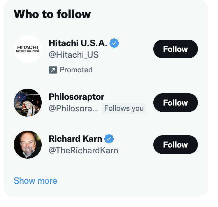 for a year my Who to follow has been UNCHANGED: - Ad - Band from my college that broke up 11 years ago with 7 followers - My own UCB Harold team that disbanded 6 years ago but i like that one richard karn nft tweet and now... What is this algorithm??pic.twitter.com/6XCcpcAukG