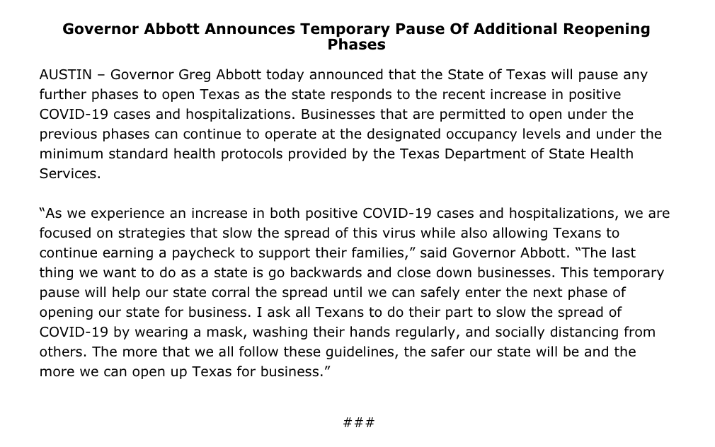 I frankly can't think of an industry that hasn't been able to reopen in some capacity. Bars are supposed to be at 50% still, but as TABC has found, not all are adhering to that. https://www.dshs.state.tx.us/coronavirus/opentexas.aspx …