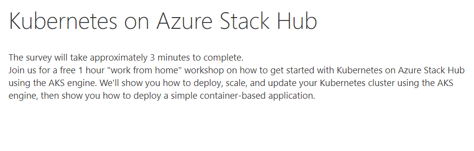 #AzureStack product group for a free 1 hour "work from home" workshop on how to get started with Kubernetes on Azure Stack Hub using the AKS engine. We'll show you how to deploy, scale, and update your Kubernetes cluster u…https://lnkd.in/eyv9fmC https://lnkd.in/enyqgMSThanks. Twitter will use this to make your timeline better. UndoUndo -