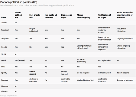 Each platform’s approach to political ads in one table https://buff.ly/2YQydpF pic.twitter.com/5qZE4dxF38