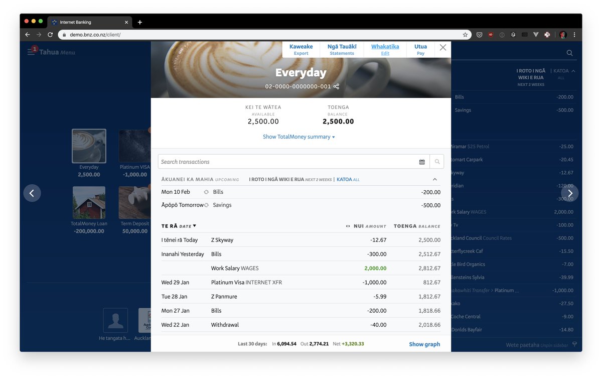 @BNZ's internet banking has a unique UX pattern I've never seen: language learning mode. You can flip a setting for the indigenous Māori language which shows English *and* Māori in the UI to expand your vocabulary in the productpic.twitter.com/XbLtKzTuDG