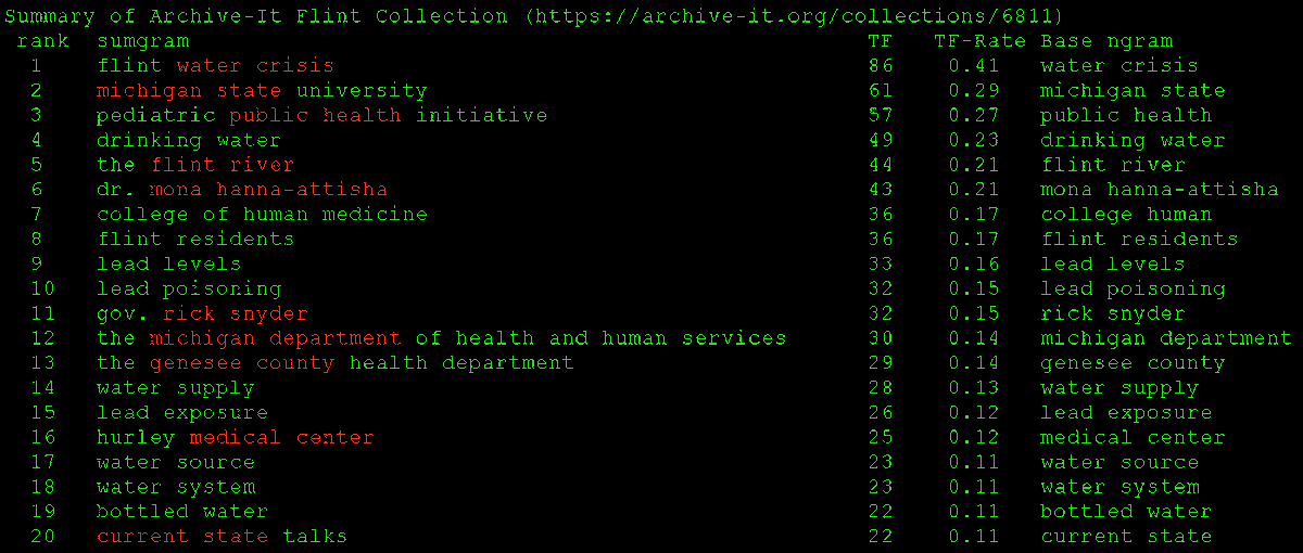 @WebSciDL new in sumgram is base ngram printing/highlighting (red text). This makes it easier to identify domain-specific stop words to rm E.g. is summary of@archiveitorg Flint collection (https://archive-it.org/collections/6811 …) Install: $ pip install sumgram Github: https://github.com/oduwsdl/sumgram/ …pic.twitter.com/V3M0BZhoFQ