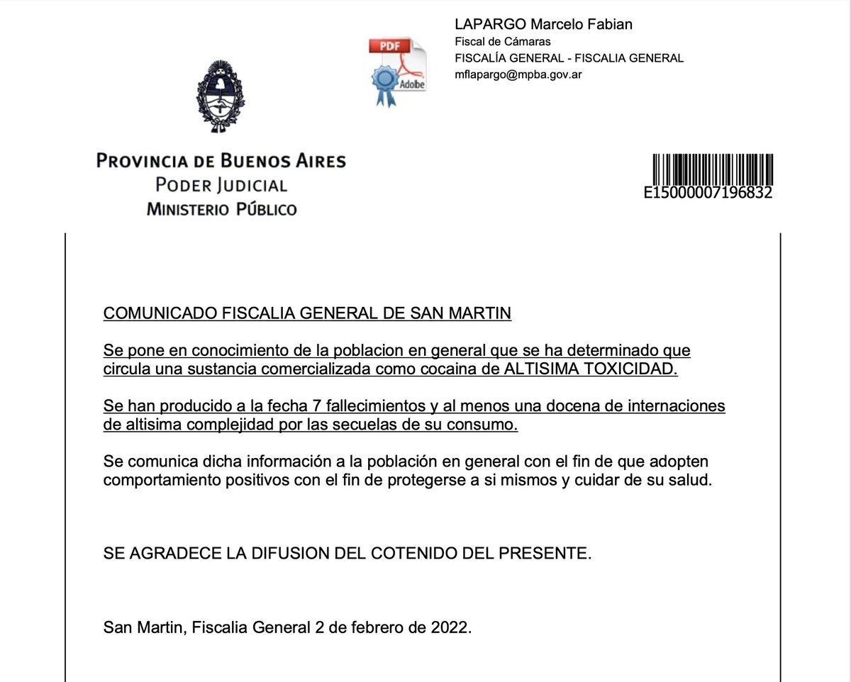 Comunicado de la Fiscalía General de San Martín en relación a los fallecimientos por consumo de cocaína de las últimas horas.pic.twitter.com/Bw1FSo9kTR