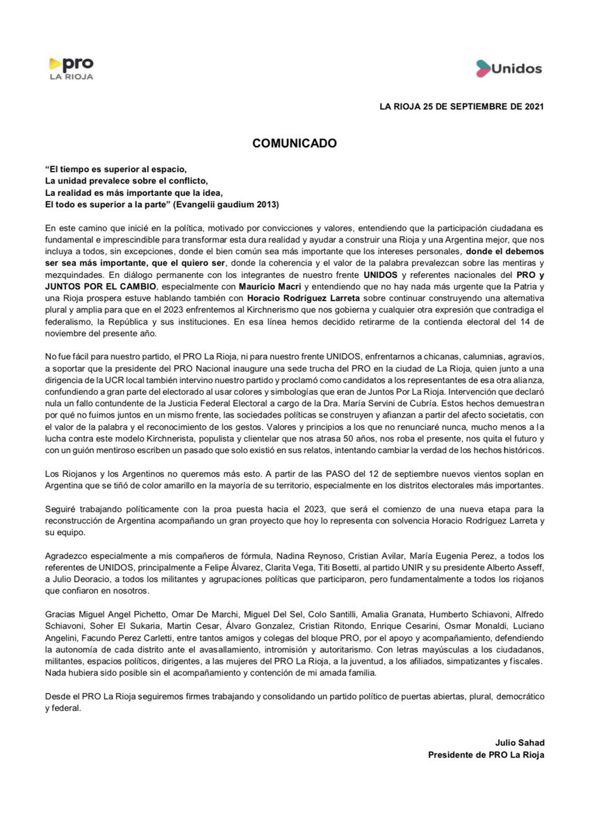 Este es el momento donde debemos mostrar humildad, generosidad y vocación de sumar para que la Argentina tenga la oportunidad de cambio que tanto soñamos.