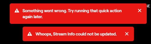 trying to update stream title and getting this, anyone solve this before? Tried multiple browsers, logging out and in etcpic.twitter.com/dDhgUj6rcl