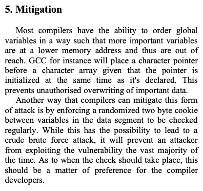 Remember, there are no compiler protections against data segment buffer overflows except reordering variables to place higher risk variables (such as pointers) before arrays.pic.twitter.com/YXaIXm7soX