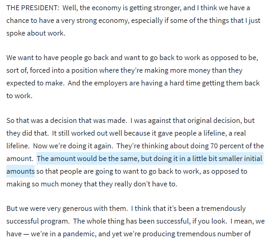 Here's from the White House transcript on Trump discussing the unemployment benefits increase:pic.twitter.com/eZDAXDB9GT