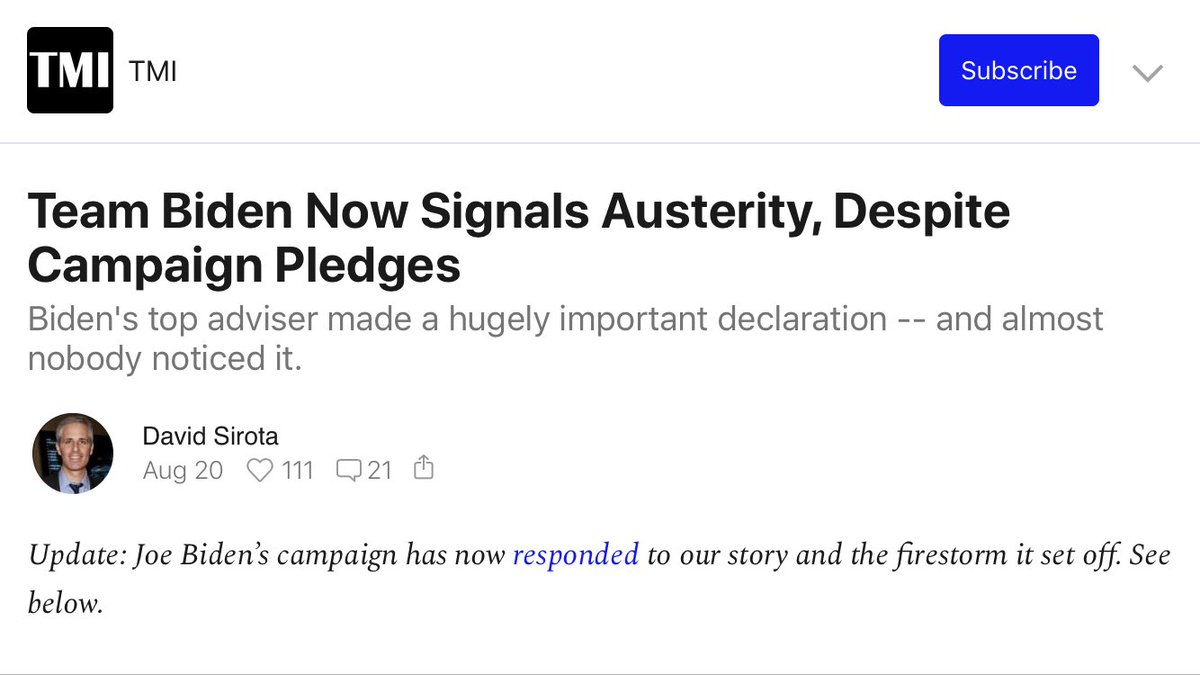 Biden campaign consultant would prefer you don’t read @davidsirota, great reason to subscribe IMO https://sirota.substack.com pic.twitter.com/iHb4NPCf26