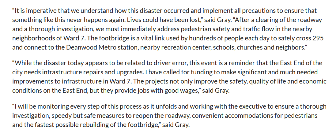 We are very fortunate that the tragedy on 295 did not result in any fatalities. It is imperative that we understand how this disaster occurred and implement all precautions to ensure that something like this never happens again. Lives could have been lost. https://thedcline.org/2021/06/23/press-release-councilmember-vincent-c-grays-statement-on-the-dc-295-pedestrian-bridge-collapse/ …pic.twitter.com/eFS7hHqeXC