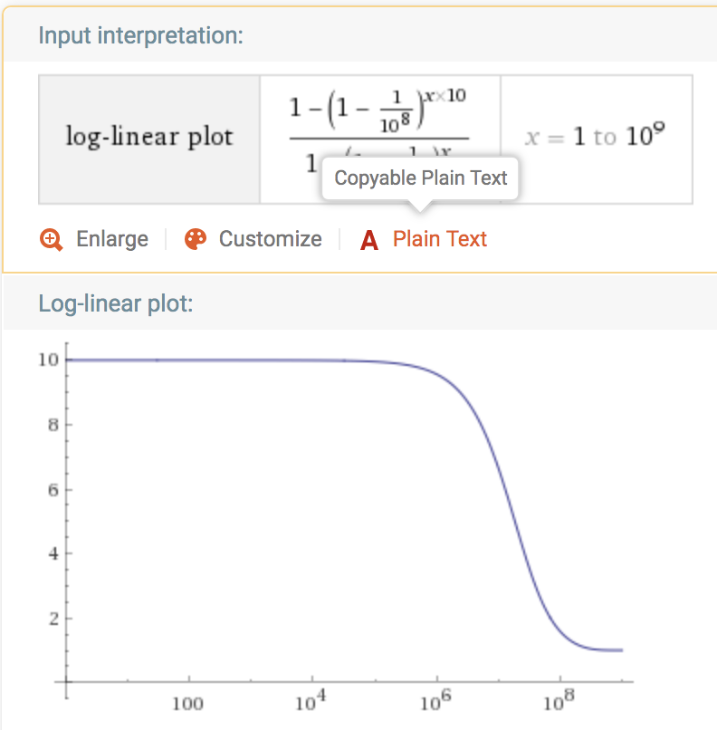 Alright. Let the prob. that a random input exposes a bug be θ, then the exp. prob. that the bug is revealed after n inputs is 1-(1-θ)^n and 1-(1-θ)^(nx), resp. for a fuzzer with with x more cores. The factor improvement is ((1-θ)^n)-(1-θ)^(nx))/(1-θ)^n). For θ=10^-4 and n=10^3,pic.twitter.com/uboLmqz7L1