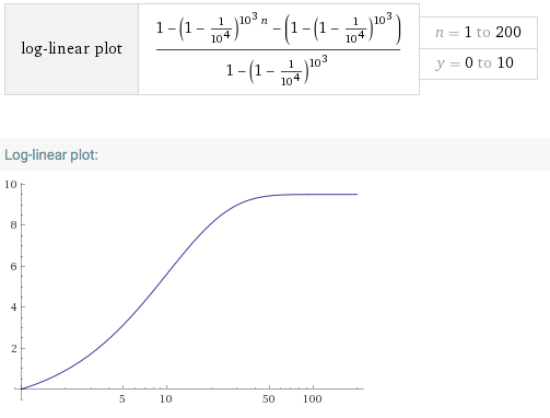 Alright. Let the prob. that a random input exposes a bug be θ, then the exp. prob. that the bug is revealed after n inputs is 1-(1-θ)^n and 1-(1-θ)^(nx), resp. for a fuzzer with with x more cores. The factor improvement is ((1-θ)^n)-(1-θ)^(nx))/(1-θ)^n). For θ=10^-4 and n=10^3,pic.twitter.com/uboLmqz7L1